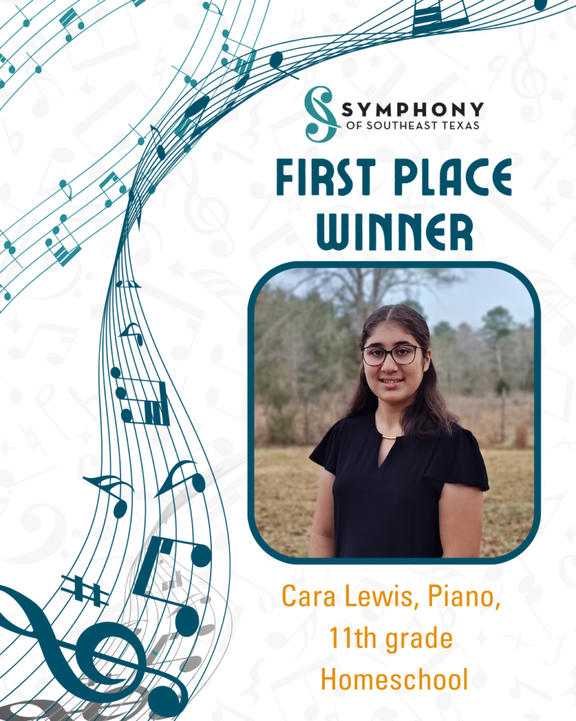 Cara thanks her piano teacher Dr. Jacob Clark, her homeschool band director Mrs. April Anderson, and her parents for helping and supporting her on her musical journey. She currently has plans to continue her music education by majoring in music at Lamar University.