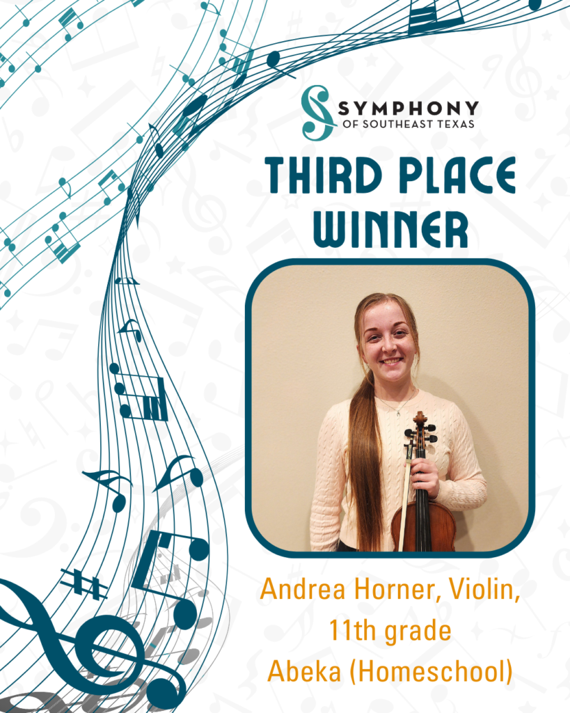 Andrea Horner is a homeschooled violin player in the 11th grade. She has been playing the violin since 2016 and has been in violin lessons since she was 6 years old.