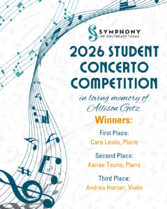 The Symphony of Southeast Texas is thrilled to announce the results of the 2024 Concerto Competition. The first-place winner is flutist Claire Ren from Beaumont, a student at Monsignor Kelly High School. She has won the prize of $750 and the honor of playing her competition piece, Howard Hanson’s Serenade for Flute and Orchestra, at the Youth Education Concerts. Led by Maestro Chelsea Tipton … [Read more...] about Claire Ren wins 2024 Concerto Competition